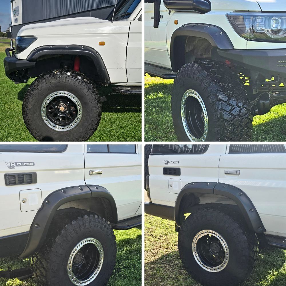 Finally, the pocket style flares are here at amazing prices to suit Toyota Landcruiser 76 series. These flares are perfect for those who don't want to drill into their guards but still want that jungle flare look. Stay legal with extra wheel cover and give your car a personalized look to stand out from the crowd
