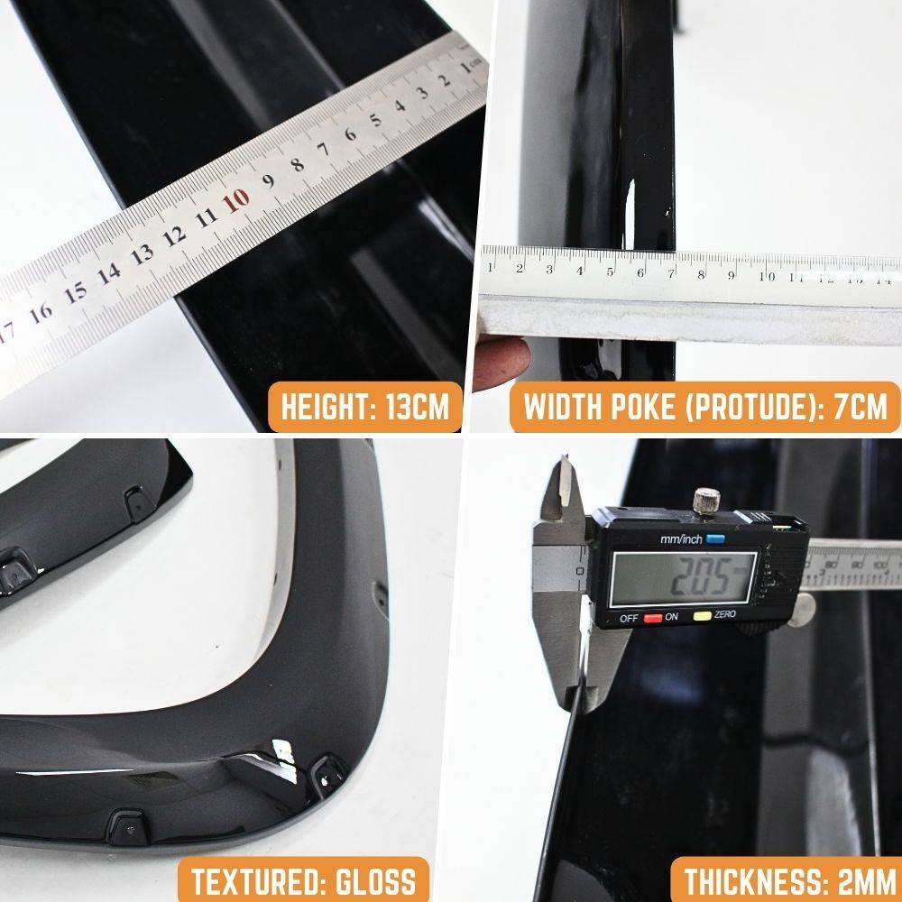 Designed to give your car a bolted fender flares look without drilling. These flares are a gloss black finish and are made from high-quality 2mm thick ABS plastic providing maximum protection to your vehicle from mud and debris.
