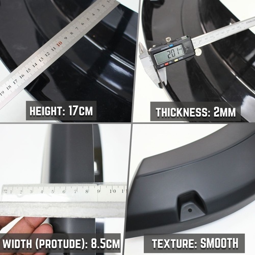 Designed to give your car a bolted fender flares look without drilling. These flares are a smooth matte finish and are made from high-quality 2mm thick ABS plastic providing maximum protection to your vehicle from mud and debris.