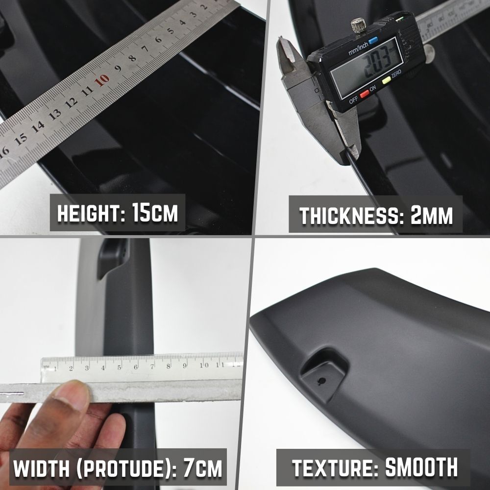 Designed to give your car a bolted fender flares look without drilling. These flares are a smooth matte finish and are made from high-quality 2mm thick ABS plastic providing maximum protection to your vehicle from mud and debris.