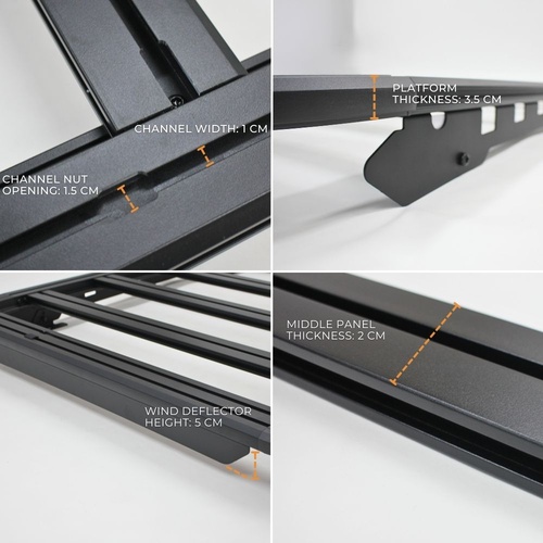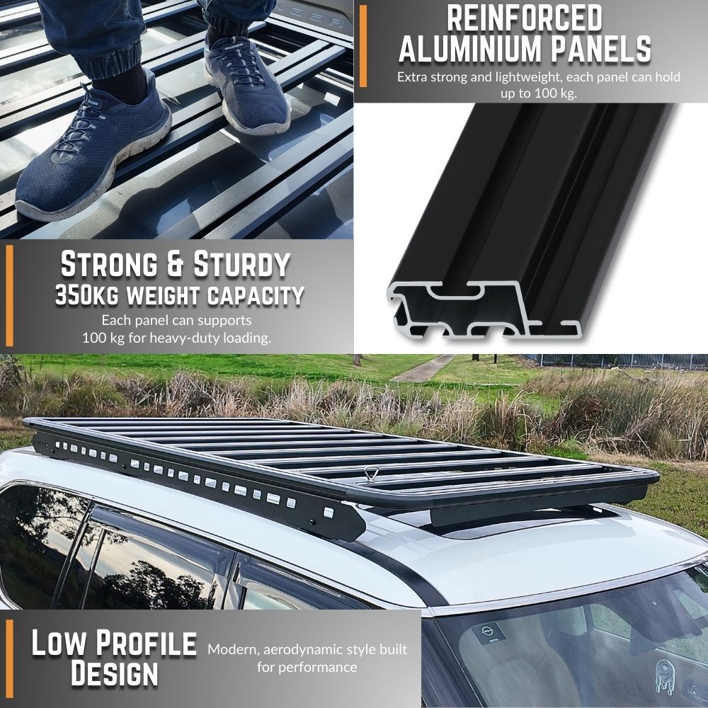 NOTE: This premium-quality roof rack typically retails for more than $1,500 other retailers. Each panel is engineered to support upto 100 kg, offering exceptional strength and durability. The design features multiple accessory channels for versatile mounting options, along with integrated tie-down anchor points — all included in the package. Quite simply, nothing else under $1,500 comes close.
