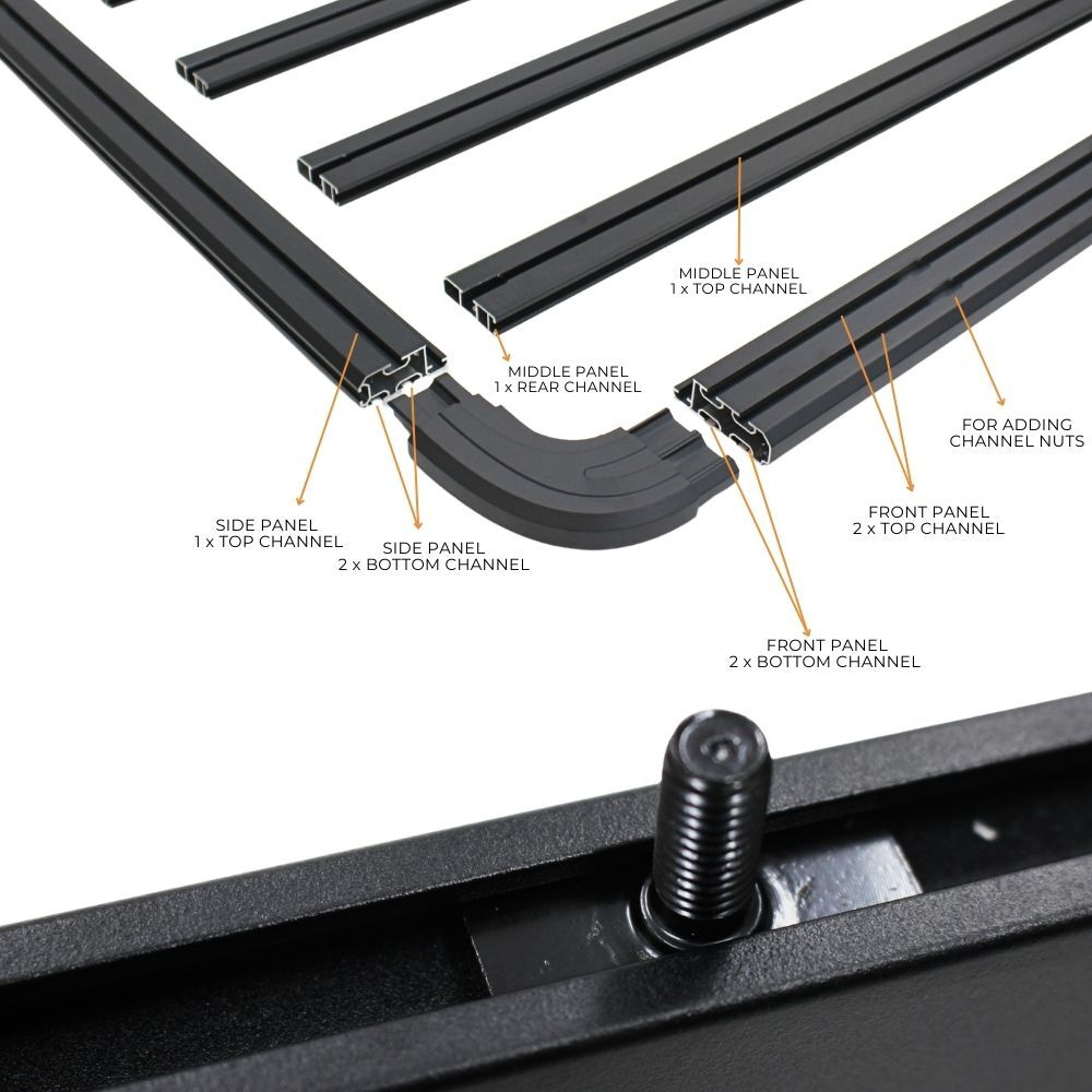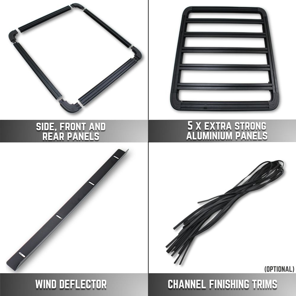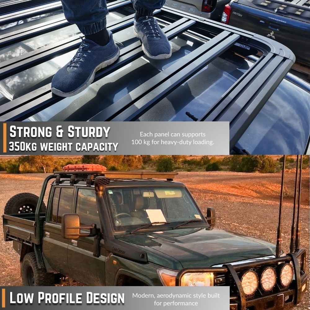 NOTE: This premium-quality roof rack typically retails for more than $1,500 other retailers. Each panel is engineered to support upto 100 kg, offering exceptional strength and durability. The design features multiple accessory channels for versatile mounting options, along with integrated tie-down anchor points — all included in the package. Quite simply, nothing else under $1,500 comes close.