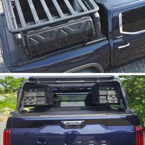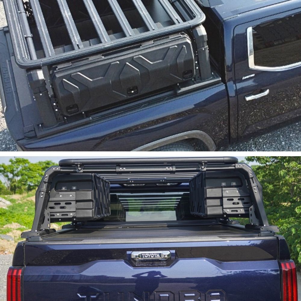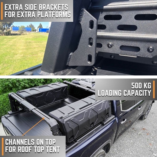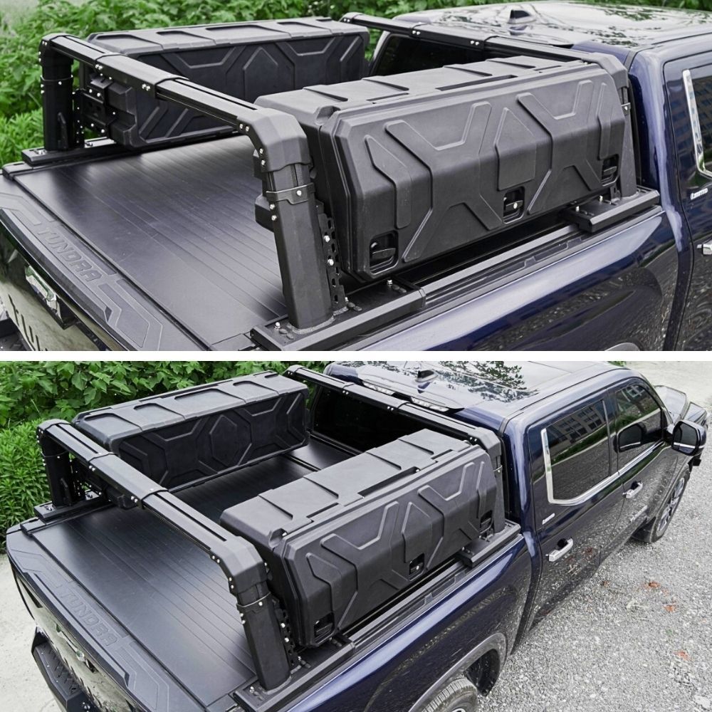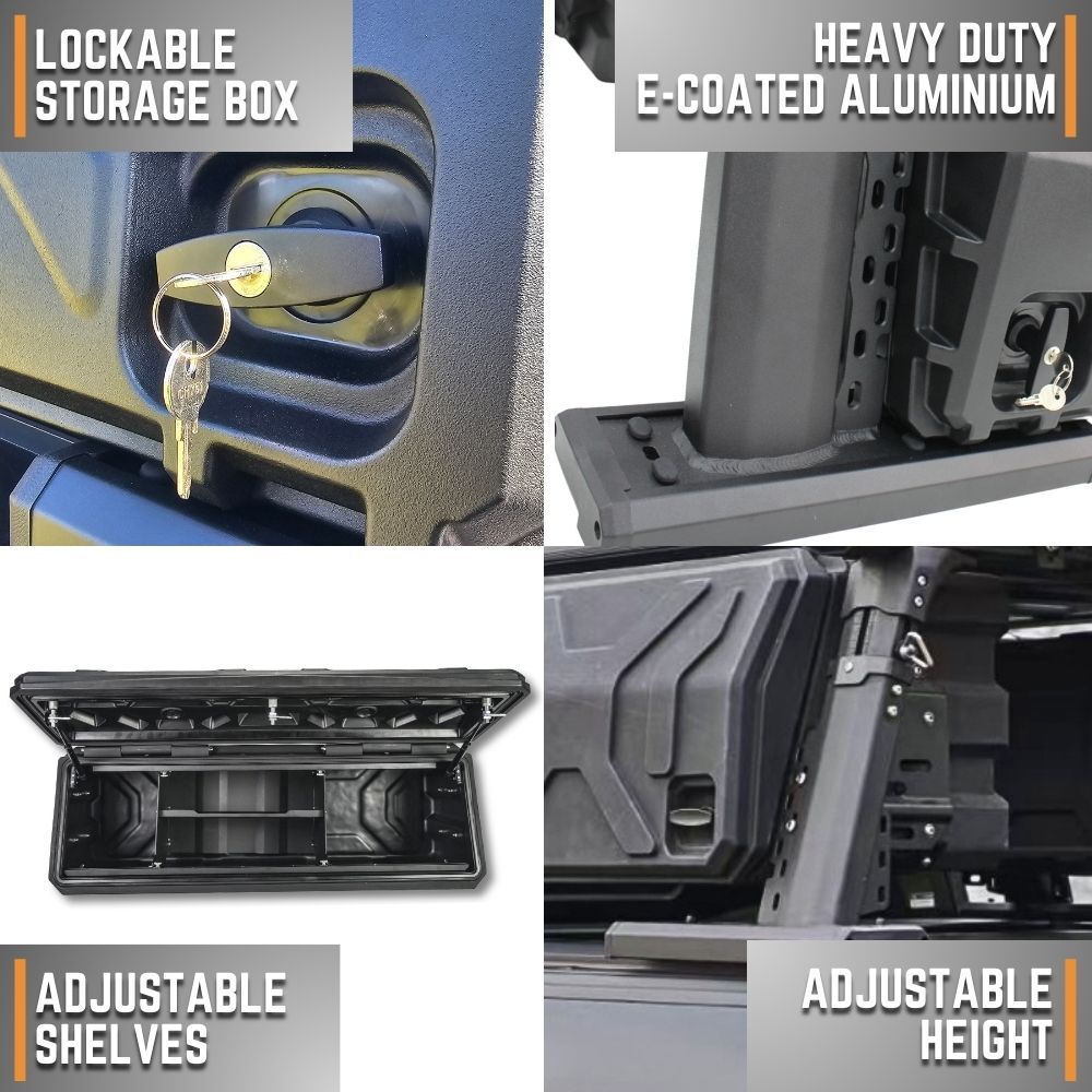 This rack stands out as one of the sturdiest available, featuring 2 lockable storage boxes with adjustable shelves, channels for adding a roof platform or rooftop tents, and brackets to install a low-profile platform between the boxes for extra gear. With full adjustability in height, width, and length, this tub rack transforms your vehicle into a tough, rugged rig—perfect for those who don’t want a canopy but still need extra storage above their tub or roller shutter, without the added weight of a canopy.