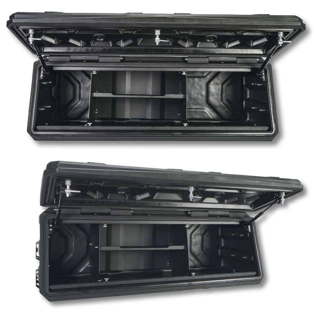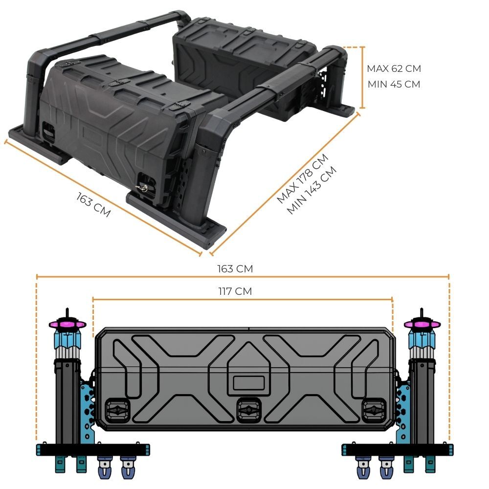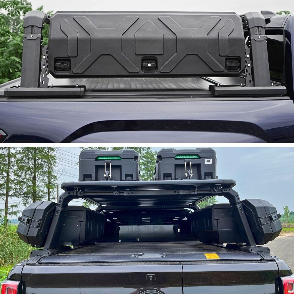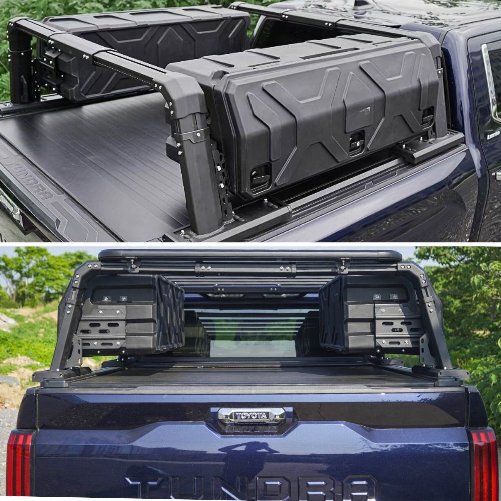This rack stands out as one of the sturdiest available, featuring 2 lockable storage boxes with adjustable shelves, channels for adding a roof platform or rooftop tents, and brackets to install a low-profile platform between the boxes for extra gear. With full adjustability in height, width, and length, this tub rack transforms your vehicle into a tough, rugged rig—perfect for those who don’t want a canopy but still need extra storage above their tub or roller shutter, without the added weight of a canopy.