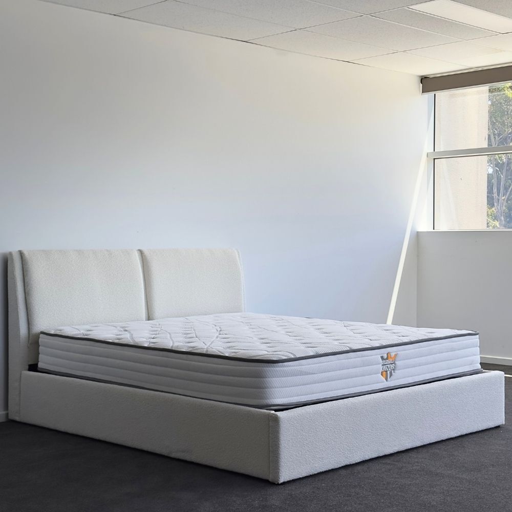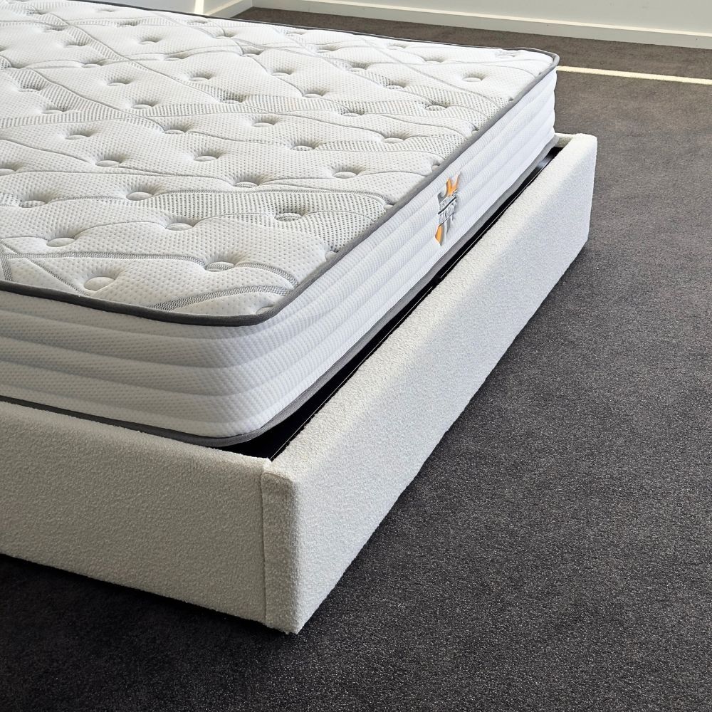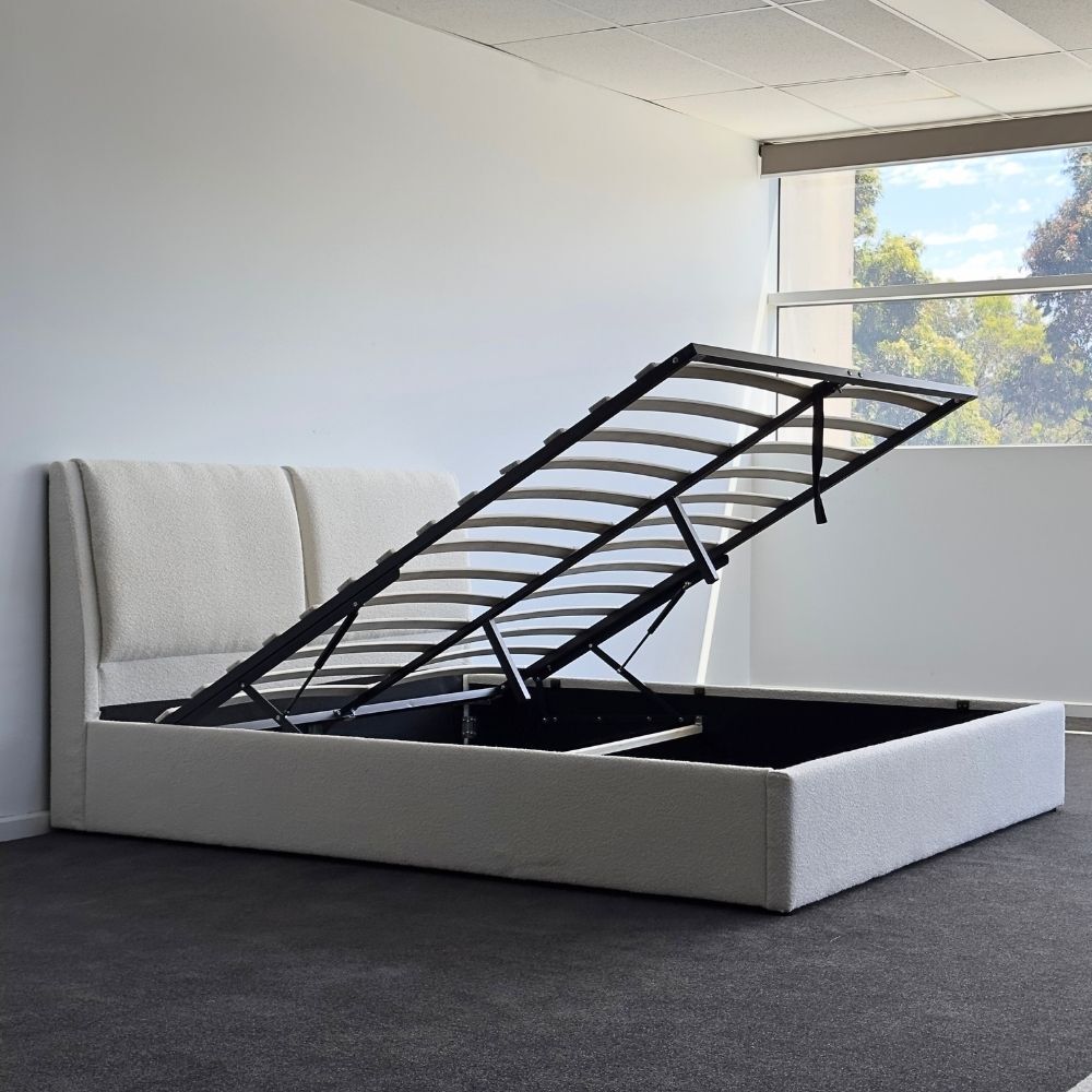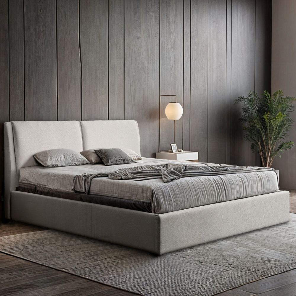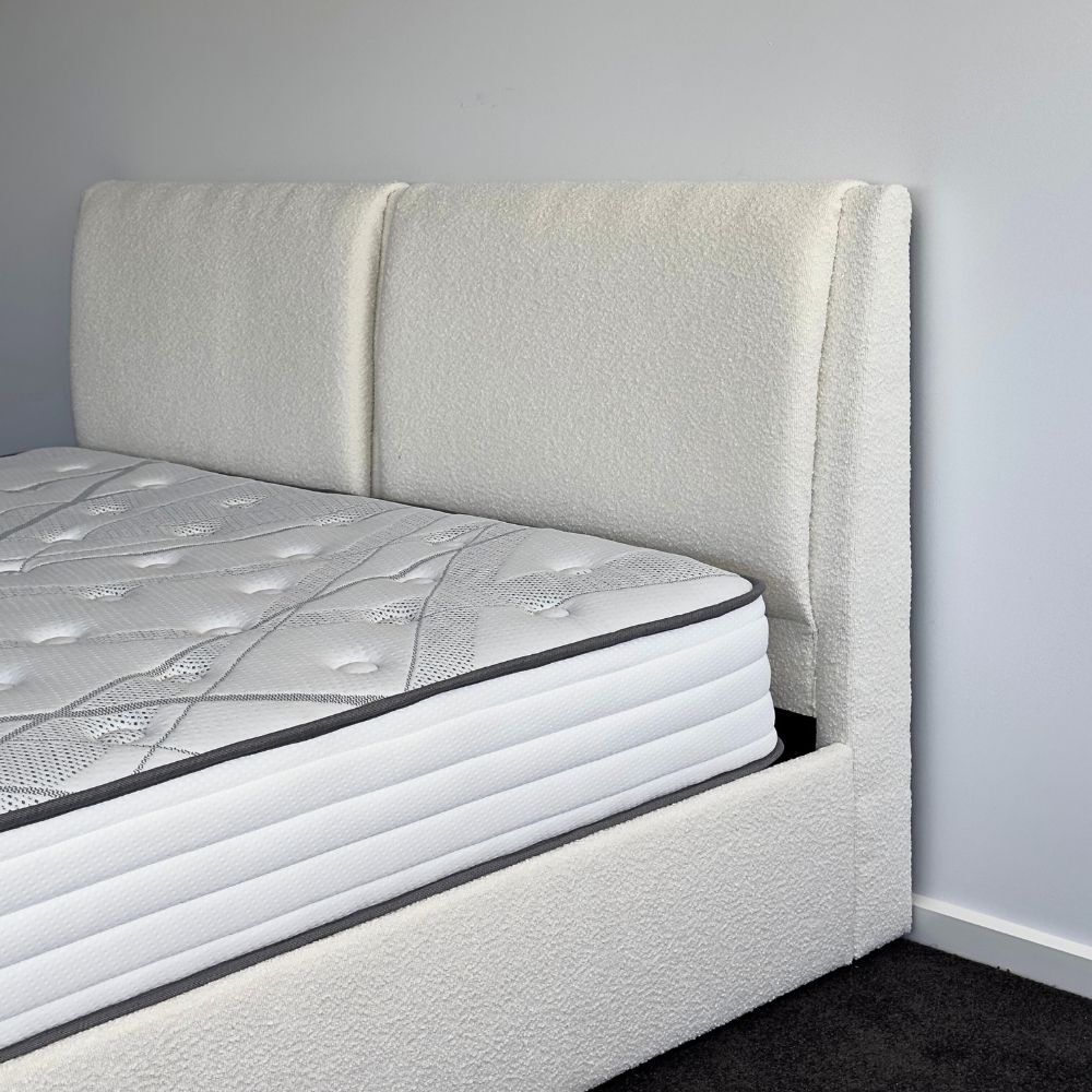 Upgrade your bedroom aesthetics with our contemporary Madison king-size bed! Wrapped in a soft beige boucle fabric, this bed showcases a stylish design that effortlessly blends comfort and sophistication. Equipped with a convenient gas lift mechanism, it's not just visually appealing but also practical. Redefine your sleep space with the modern charm of our Madison bed, the perfect addition to elevate your home decor.