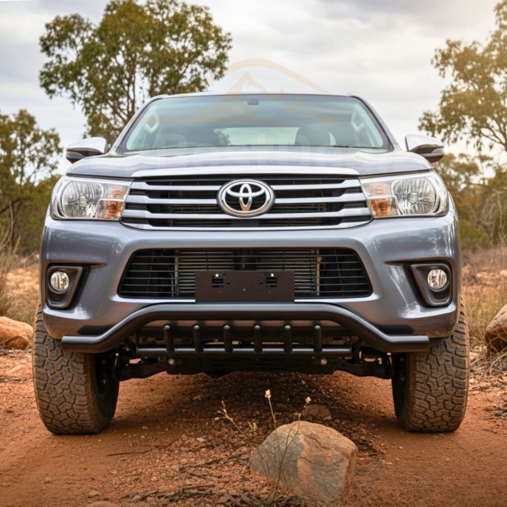 Featuring a sleek, modern design and rugged construction, this nudge bar not only provides superior protection for your Hilux but also enhances its bold and adventurous appearance. Unlike OEM-style nudge bars that only shield the centre section, this design offers extended coverage, protecting the sides of your bumpers as well.