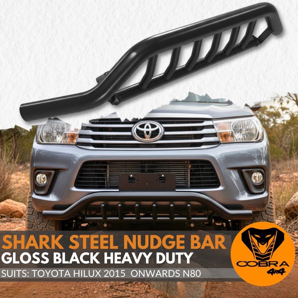 Introducing the Cobra 4x4 Shark Steel Nudge Bar, the ultimate front-end protection for your Toyota Hilux 2015 Onwards N80 models. Expertly engineered and crafted from premium black powder-coated steel, this nudge bar delivers unmatched durability and rugged style.