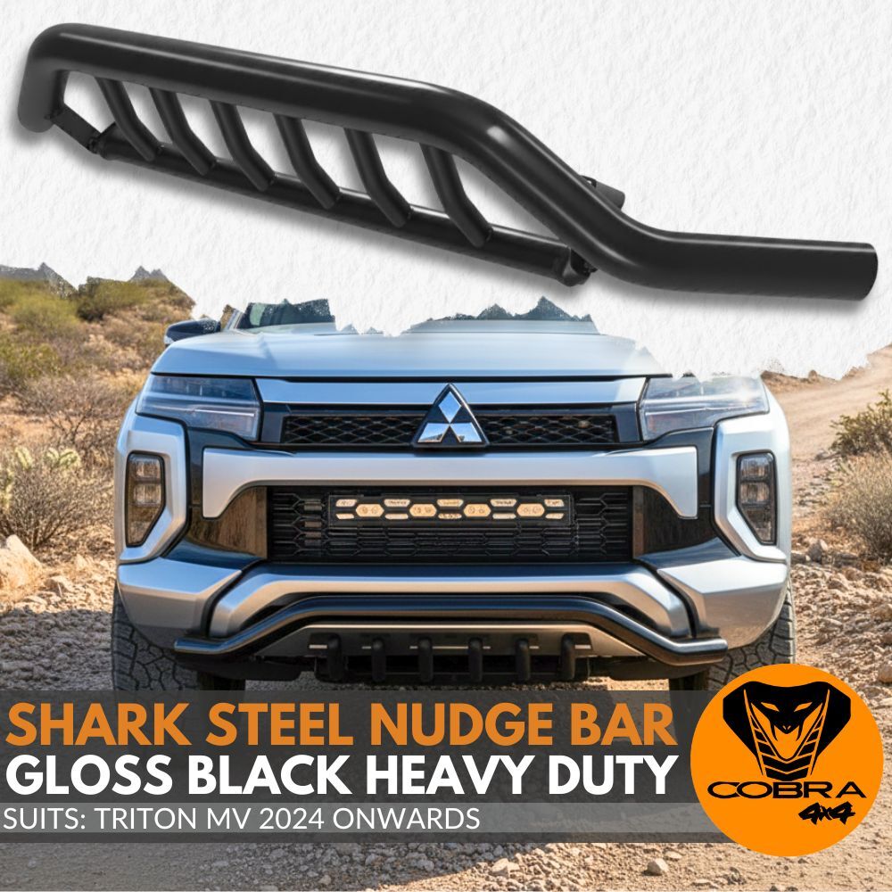 Shark Nudge Bar Gloss Black Heavy Duty Steel Suits Mitsubishi Triton MV 2024 Onwards Front Grill Bull Bumper Guard