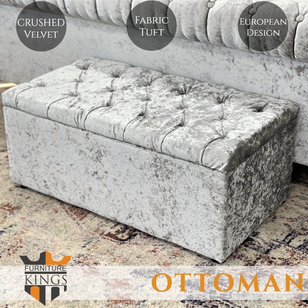 Make the most of your space with our contemporary Crushed Velvet Ottoman! Upholstered with a soft to touch Crushed velvet in a Silver color with fabric button tufts, you can't go wrong with this beautiful and simple design for your home including the extra storage space