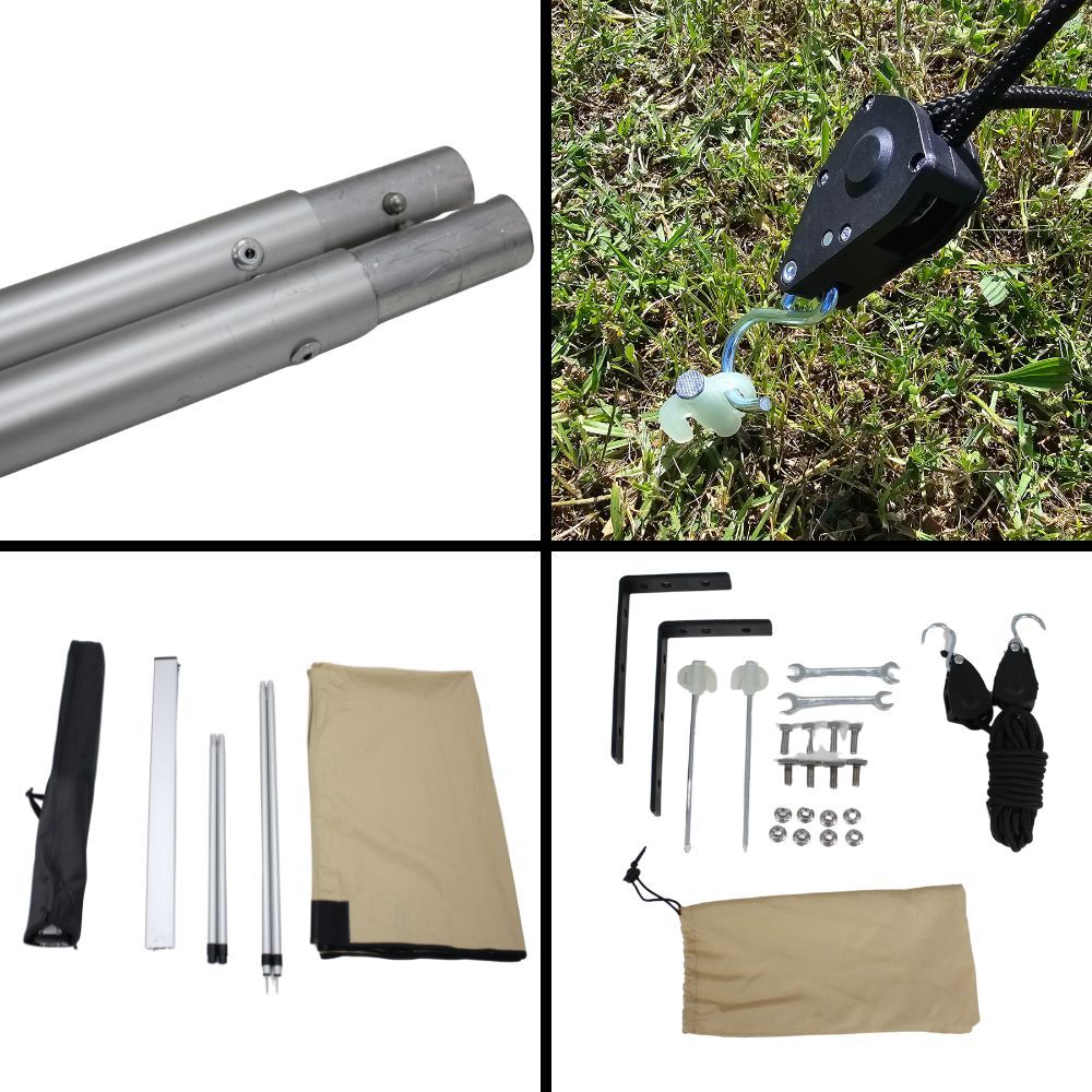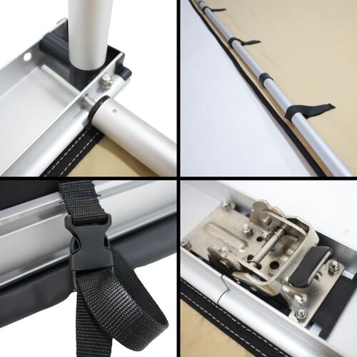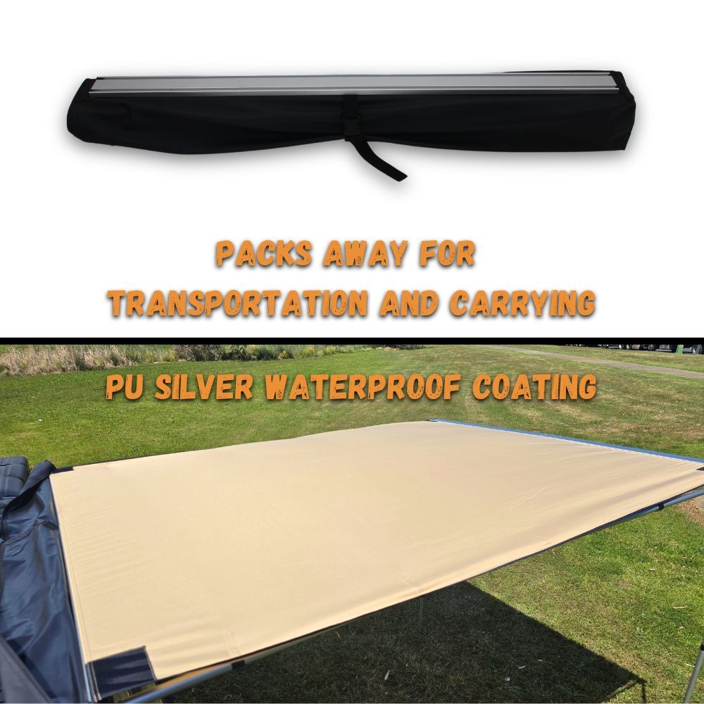 Constructed from high-grade 420D Oxford canvas, this awning boasts superior strength and longevity. Unlike standard options that often use polyester ripstop and 280GSM fabric to cut costs, our awning stands out with double the quality, ensuring you’re covered against rain and harsh sunlight.