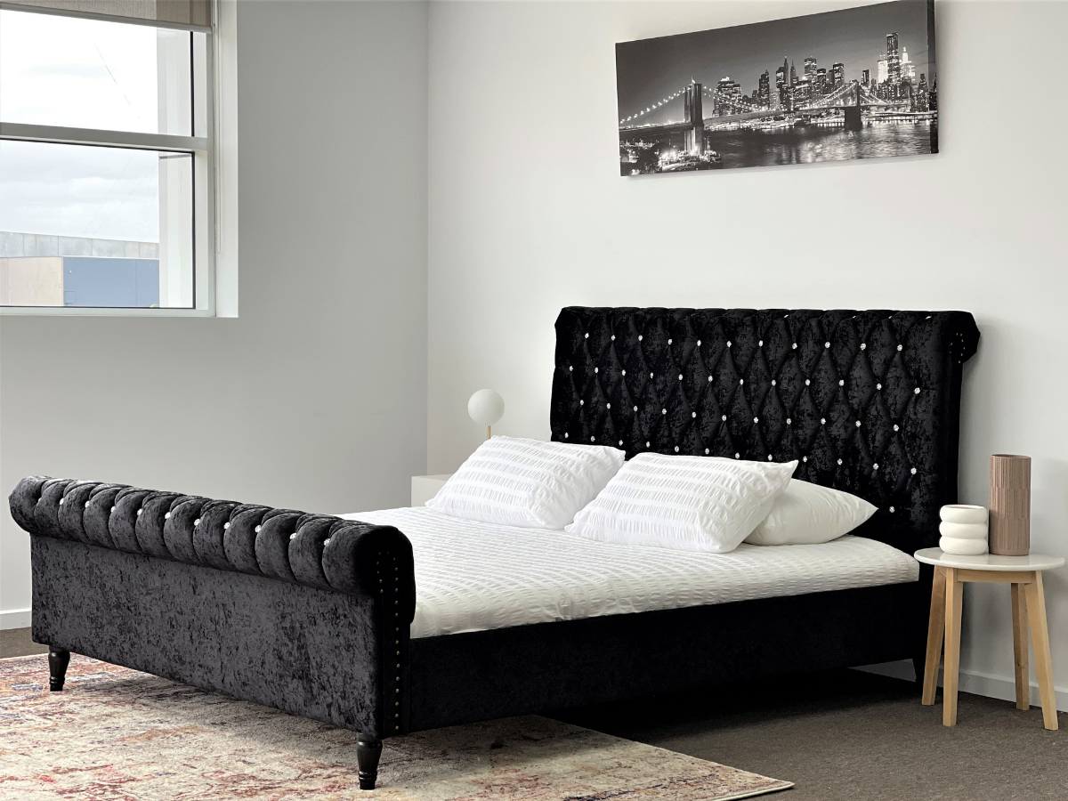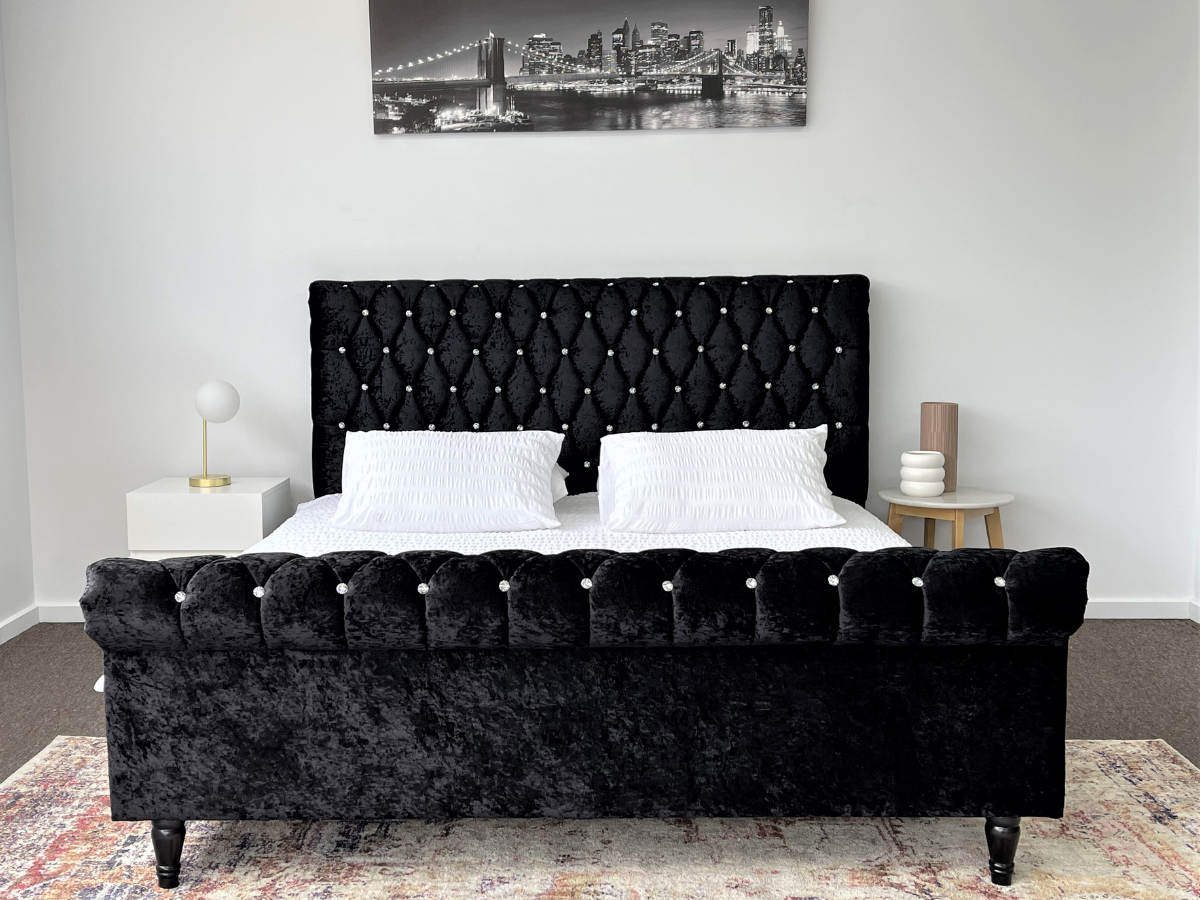 This bed is quickly becoming a new fave. Upholstered in Black velvet all round and accented with crystal studs along the headboard and footboard. Look no further! The classic, mid-century modern design is a must-have furniture piece in all bedroom decore. Ideal for your guest room or master bedroom, the design, construction and overall functionality are certain to grace your interior with a bit more charm.