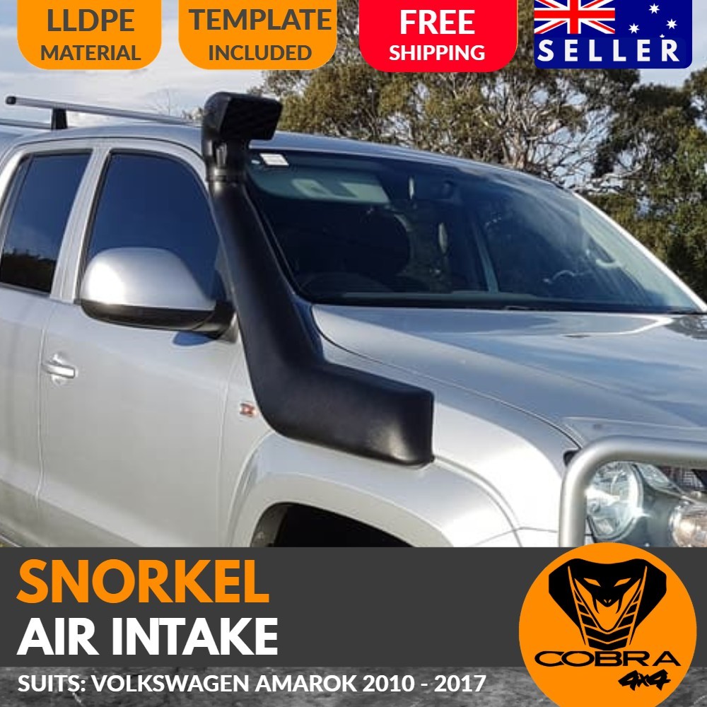 Our Cobra 4x4 Snorkels are made to fit the Volkswagen Amarok 03/2011 - Onwards They are made from Linear Low Density Polyethylene (LLDP) which is a strong, durable plastic widely found in the auto parts industry for items that require long life, impact resistance and good UV durability. Typical wall thickness of our snorkels is 5-6mm which will provide maximum resistance against impact damage. With our snorkels, all parts included are designed to fit correctly, if installed properly, it will provide a water and dust proof path for your air intake system. This will save your engine against costly repairs from water damage, and reduced air filter servicing costs as it will draw cleaner air from its elevated intake. This is particularly beneficial while following other vehicles on dry dusty roads.