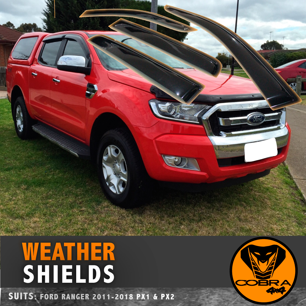 The Cobra 4x4 Weather shields to suit the Ranger Px1 Px2 Px3 2011 - 2021 dual cab models are made from impact-modified acrylic for